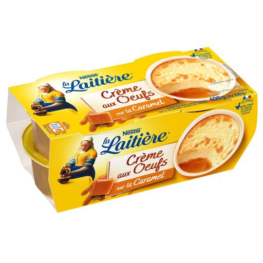 Ingrédients : LAIT entier (51,6%), caramel (12,0%) [sirop de glucose, eau, sucre, LAIT concentré, amidon modifié, arôme, sel, fibres d'agrumes, conservateur (E202)], OEUFS frais (11,9%), crème (LAIT) (11,1%), sucre, poudre de LAIT écrémé, amidon modifié, amidon, arôme, colorant (bêta-carotène).