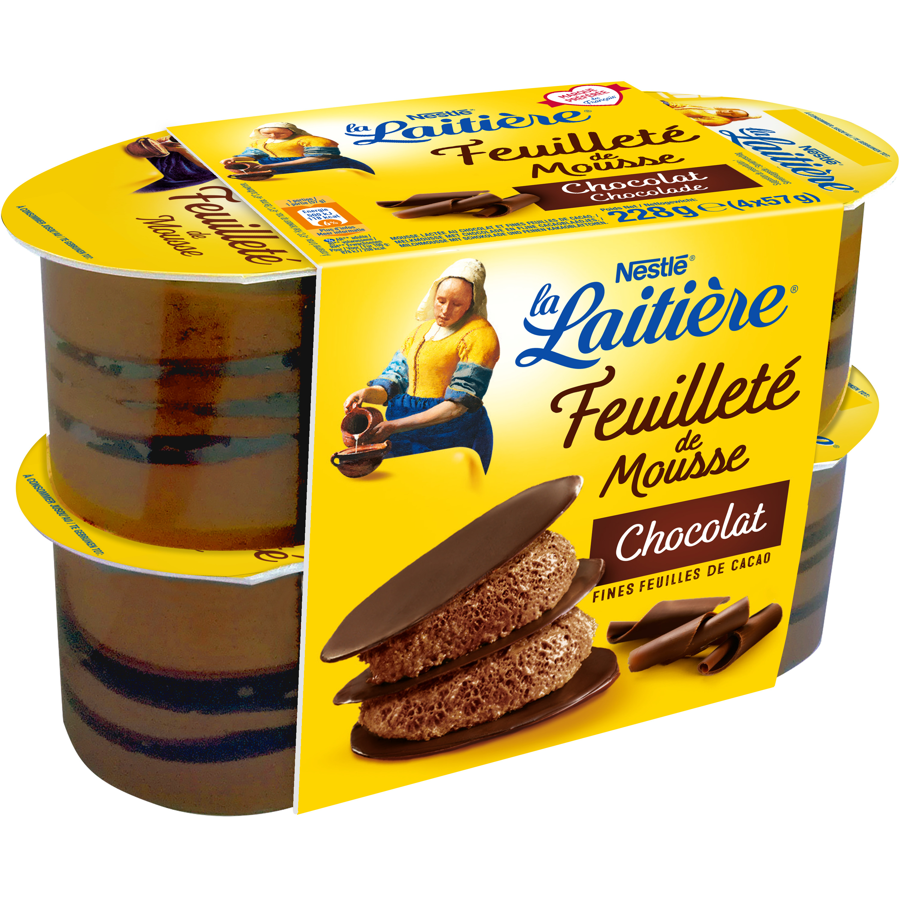 Chez La Laitière, nous ajoutons délicatement de fines feuilles de cacao craquantes à notre mousse au chocolat, pour un jeu de texture très gourmand.