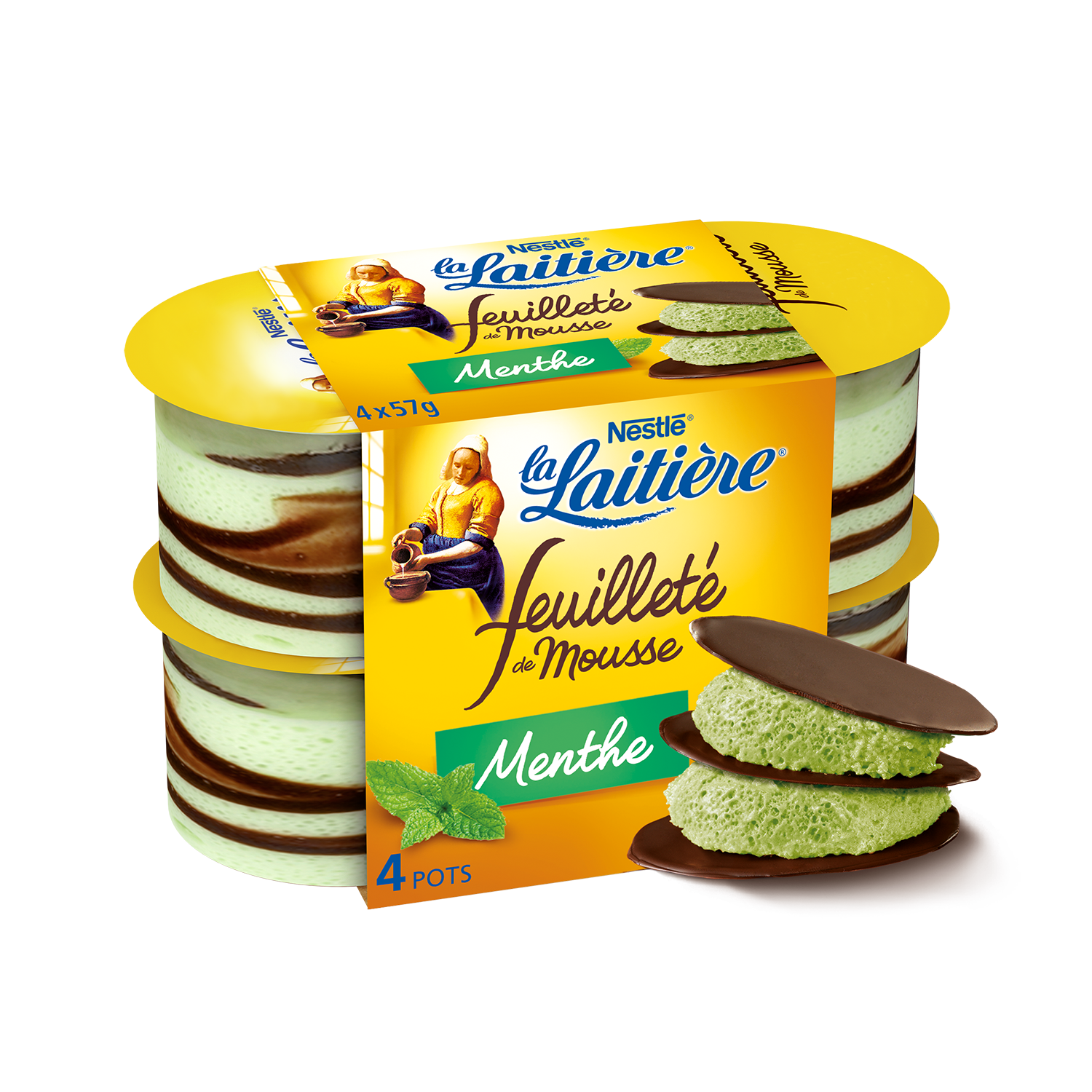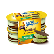 Feuilleté de Mousse à la menthe de La Laitière, c'est l'alliance unique de fines feuilles de cacao croquantes mariées à une mousse à la menthe. Cette mousse est fabriquée à Vallet (Loire-Atlantique) avec du lait origine France.