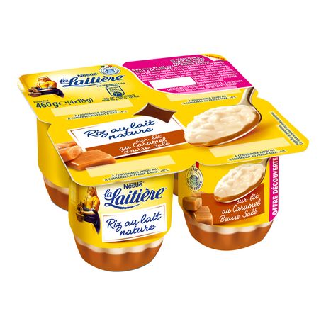 Le riz au lait Nature sur lit de caramel de La Laitière a été préparé à Vallet (Loire Atlantique) avec des ingrédients de qualité sélectionnés avec soin : du lait entier français et un arôme naturel de vanille de Madagascar. Sa cuisson lente et maîtrisée assure un équilibre parfait entre le riz et le lait pour un plaisir gourmand unique. Riz au lait sur lit au caramel beurre salé