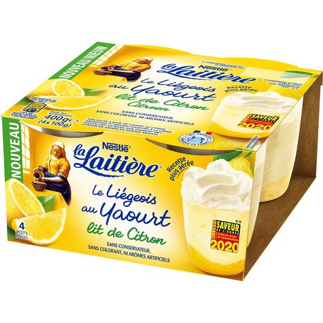 Spécialité à base de yaourt au citron ou à la noix de coco, aromatisé et mousse fouettée à la crème.