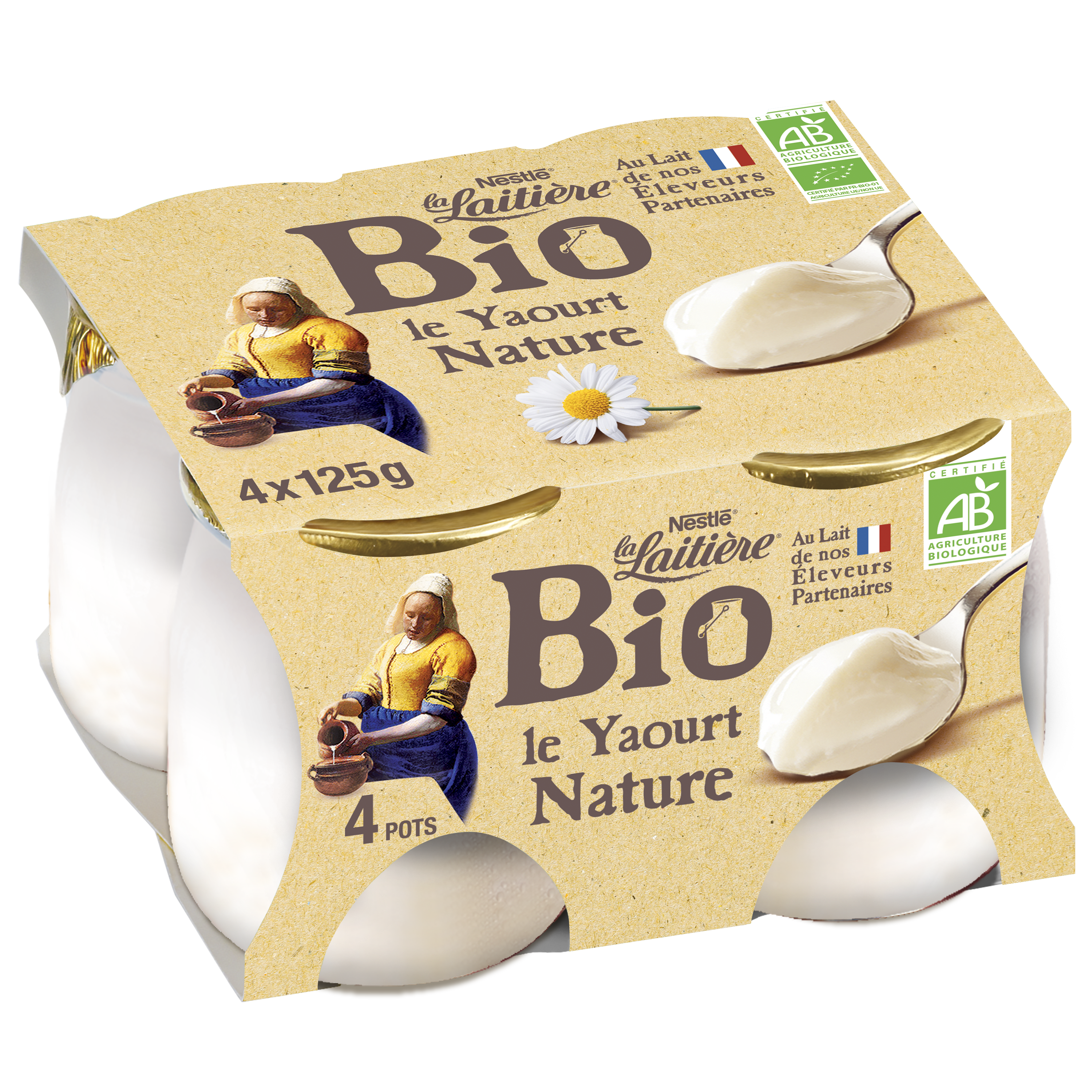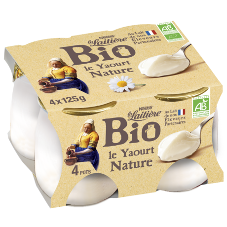 Yaourt nature "Le yaourt nature bio de La Laitière est préparé à l’étuve : c’est ce qui lui donne cette texture si fondante. Il est fabriqué en France, à Laval (Mayenne) avec du lait entier bio français collecté à proximité de la laiterie. Ce lait est issu de vaches qui sont nourries avec des aliments 100% bio et sans OGM*. L’emballage est 100% recyclable. *Seuil inférieur à 0,9% conformément à la réglementation.