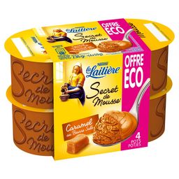 Mousse lactée au caramel et sauce au caramel Secret de Mousse au Caramel de La Laitière c’est l’alliance entre la légèreté de la mousse et un goût intense en caramel. Le secret de ce goût intense ? Un peu plus de caramel incorporé à la préparation, ce qui laisse apparaitre de fines marbrures. Cette mousse est fabriquée à Vallet (Loire-Atlantique) avec du lait origine France.