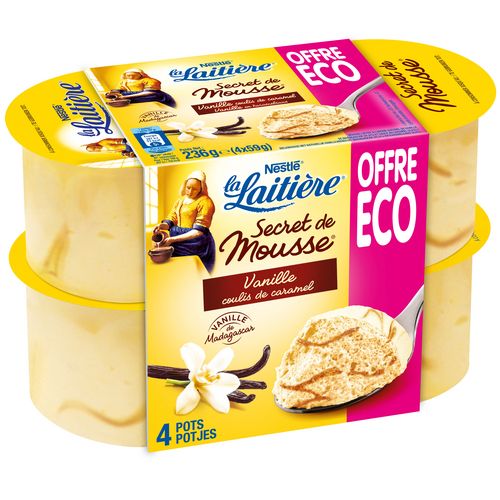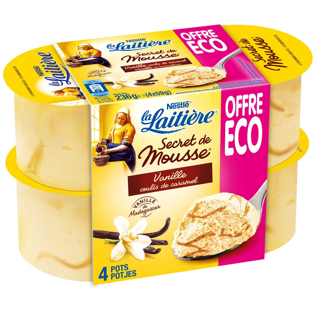 Ingrédients : LAIT entier (70,2%), sucre, crème (LAIT), caramel (2%) [sirop de glucose, sucre, eau, correcteur d'acidité (hydroxyde de sodium)], poudre de LAIT écrémé, gélatine bovine, arôme naturel de vanille de Madagascar, émulsifiant (esters lactiques des mono- et diglycérides d'acides gras), épaississants (alginate de sodium, carraghénanes, gomme xanthane), amidon modifié de maïs, jus concentré de carotte, correcteur d'acidité (hydroxyde de sodium). LAIT origine France.