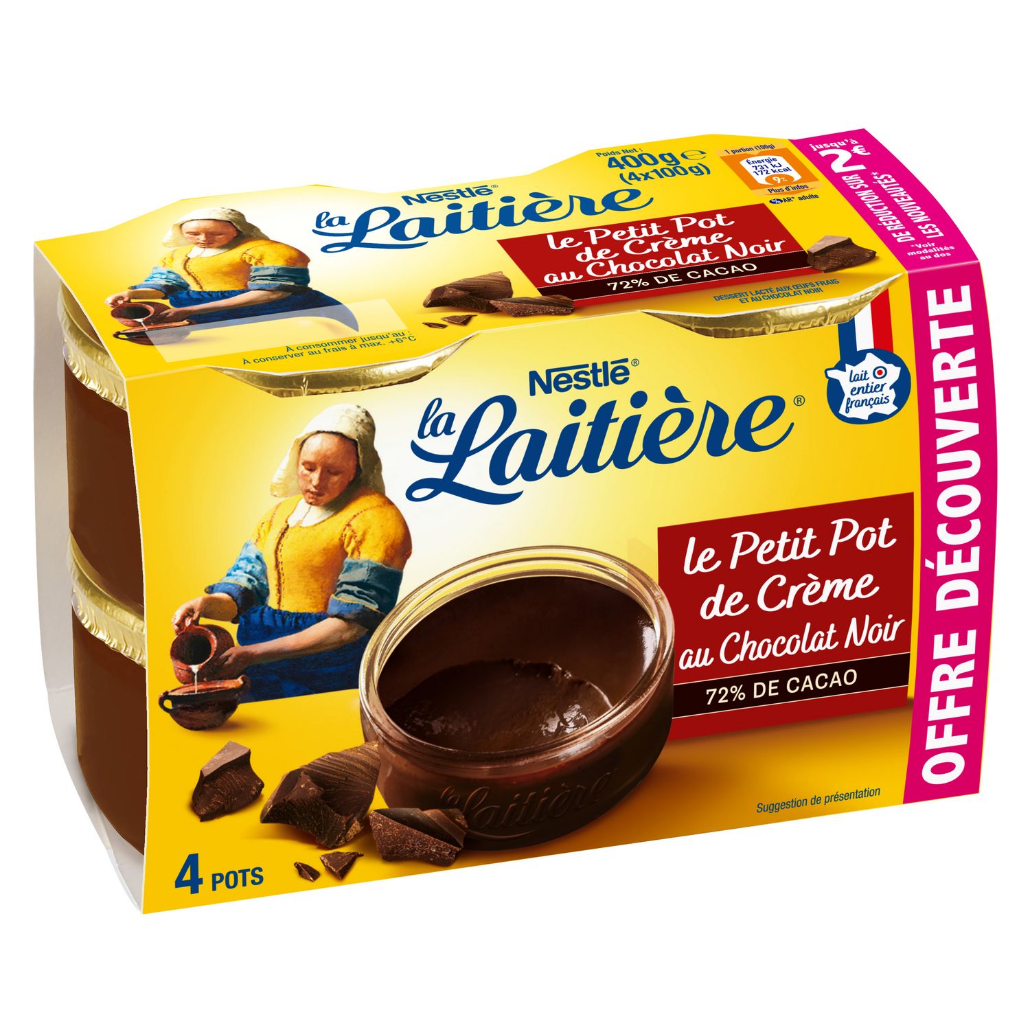 Ingrédients : LAIT entier (65,7%), chocolat noir (10,5%) [pâte de cacao, sucre, cacao maigre en poudre, émulsifiant (lécithines)], sucre, LAIT écrémé à base de poudre de LAIT, ŒUFS entiers frais (4,9%), cacao maigre en poudre, crème (LAIT) (3,9%), blancs d'ŒUFS (0,7%), poudre de LAIT écrémé.