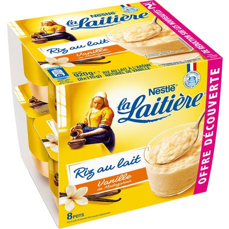 Retrouvez tous le savoir faire de la Laitière dans sa délicieuse recette de riz au lait saveur vanille. C'est grâce au secret d'une cuisson lente et maîtrisée, que La Laitière obtient l'équilibre parfait entre le riz et le lait, ce qui donne toute sa douceur à son Riz au lait ! Riz au lait saveur vanille