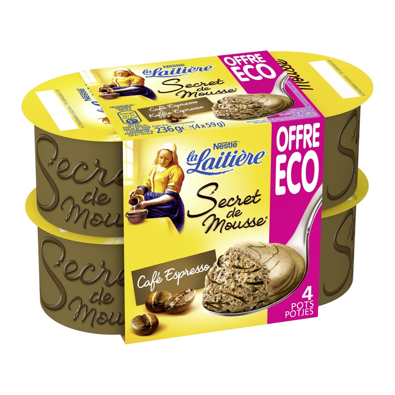 Secret de Mousse au Café de La Laitière c’est l’alliance entre la légèreté de la mousse et un goût intense en café. Le secret de ce goût intense ? Un peu plus de café incorporé à la préparation, ce qui laisse apparaitre de fines marbrures. Cette mousse est fabriquée à Vallet (Loire-Atlantique) avec du lait origine France. Mousse lactée au café, aromatisée café et sauce au café.