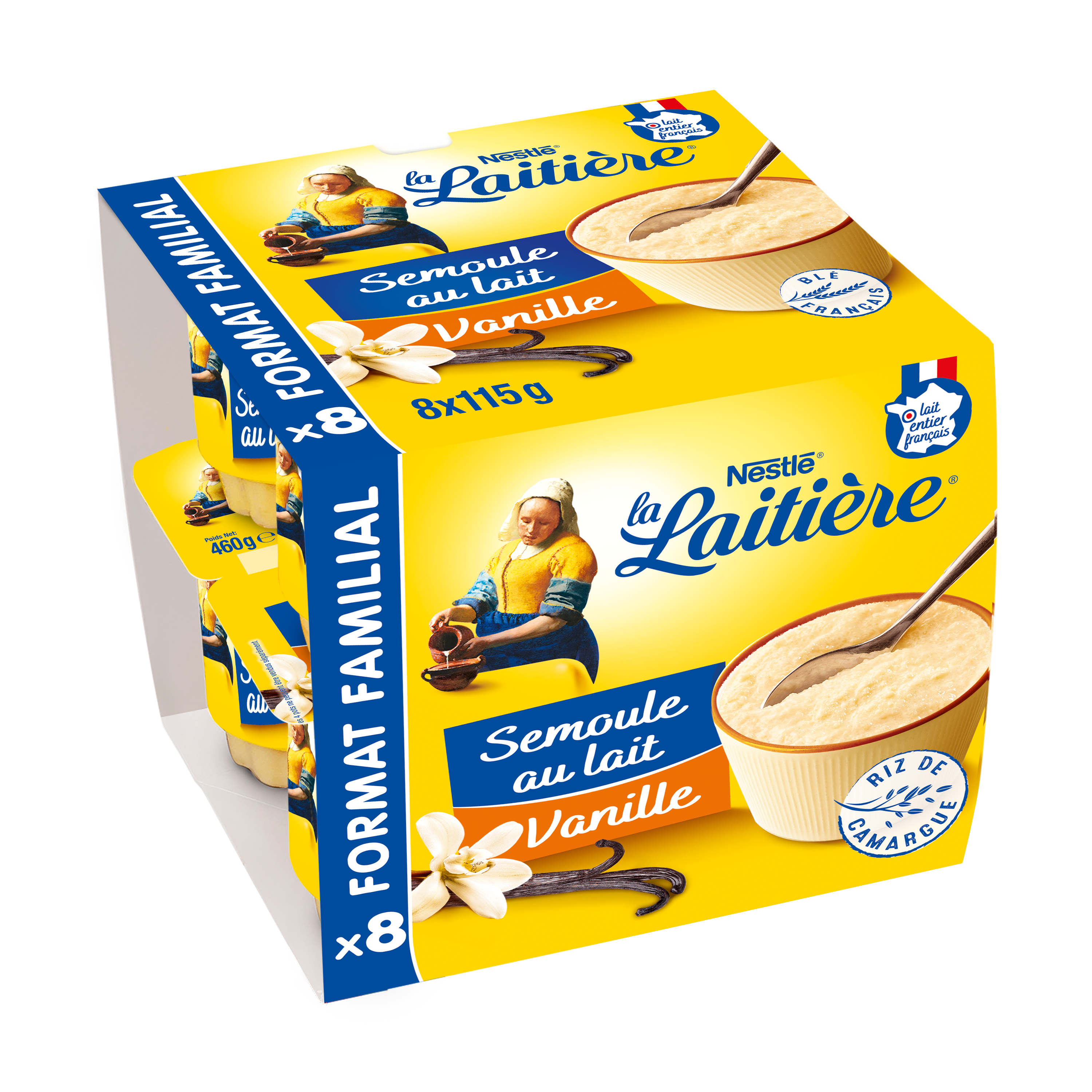 La semoule au lait vanille de La Laitière est préparée à Vallet (Loire-Atlantique) avec des ingrédients de qualité : du lait entier français, du blé français et de la vanille de Madagascar. C'est grâce à une cuisson lente et maîtrisée que l'on trouve l'équilibre parfait entre la semoule et le lait. C'est ce qui donne toute sa douceur et sa gourmandise à notre semoule au lait.