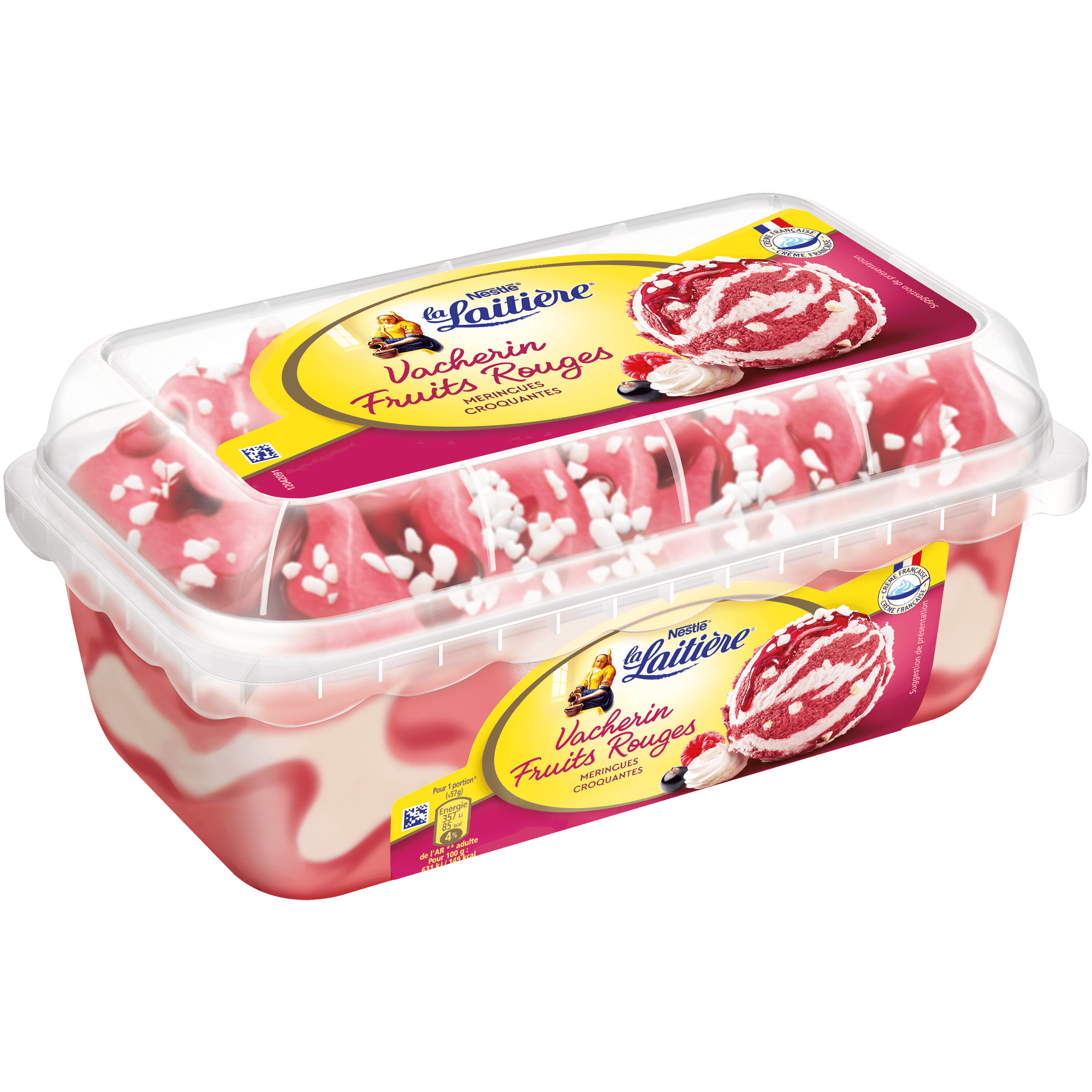 La Laitière associe son duo de crème glacée vanille et sorbet fruits rouges à des petites meringues croquantes et revisite le vacherin. Une recette gourmande à la crème fraîche, sans colorant artificiel ni arôme artificiel. Sorbet fruits rouges (fraise, framboise, cassis) (59.8%), crème glacée à la vanille, sauce aux fruits rouges, aromatisée (10.7%), éclats de meringue (3.4%) en inclusion et en décor.