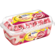 Sorbet fruits rouges (fraise, framboise, cassis) (59%), crème glacée à la vanille, sauce aux fruits rouges, aromatisée (10%), éclats de meringue (3%) en inclusion et en décor.