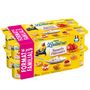 Ingrédients : Poires façon amandine: Yaourt (LAIT) (78,2%), sucre (6,8%), poires et purée de poires (5,9%), sirop de glucose, morceaux de biscuit* (2,3%), pâte d'AMANDE (0,7%) (AMANDE, sucre, eau, sirop de glucose), épaississants (pectine, gomme guar), arômes, concentré de minéraux du LAIT, correcteur d'acidité (acide citrique). Pommes façon tatin: Yaourt (LAIT) (76,2%), pommes et purée de pommes (10,2%), sucre (8,8%), morceaux de gâteau (2,0%) [farine de BLE, sirop de glucose-fructose, poudre d'OEUFS entiers, arôme], sirop de glucose-fructose, sirop de sucre caramélisé, amidon modifié, stabilisant (pectine), arôme, correcteur d'acidité (citrate de sodium). Abricots façon crumble: Yaourt (LAIT) (78,2%), sirop de glucose, sucre (6,8%), abricots et purée d'abricots (5,4%), morceaux de biscuit* (2,3%), amidon modifié, épaississant (pectine), arômes, colorant (bêta-carotène), concentré de minéraux du LAIT, correcteur d'acidité (acide citrique). Fraises façon tarte: Yaourt (LAIT) (78,2%), sucre (6,8%), fraises et purée de fraises (5,1%), sirop de glucose, morceaux de biscuit* (2,3%), amidon modifié, épaississant (pectine), arômes, jus de betterave rouge concentré, concentré de minéraux du LAIT, correcteur d'acidité (acide citrique). Framboises façon charlotte: Yaourt (LAIT) (78,2%), sirop de glucose, sucre (6,8%), framboises et purée de framboises (5,1%), morceaux de biscuit* (2,3%), amidon modifié, épaississant (pectine), arômes, jus concentrés de betterave rouge, de carottes, de baies d'aronia et de raisins, concentré de minéraux du LAIT, correcteurs d'acidité (citrate de sodium, acide citrique). Fraises façon fraisier : Yaourt (LAIT) (78,2%), fraises (10,5%), sucre (8,3%), sirop de glucose-fructose, amidon modifié, épaississants (pectine, gomme guar), arômes, concentré de carottes et cassis, concentré de minéraux du LAIT, correcteur d'acidité (citrate de sodium). * Morceaux de biscuits : sucre, farines (de BLE, riz et haricot), blancs d'ŒUFS, amidon de BLE, fécule de pomme de terre, huile de tournesol, arôme, épaississant (alginate de sodium), sel."