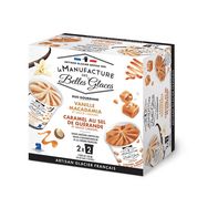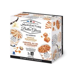 Crème glacée à la vanille Bourbon de Madagascar avec morceaux de noix de macadamia caramélisées et sauce au caramel : lait écrémé reconstitué, sucre, beurre , sirop de glucose déshydraté, sauce caramel 5% (sirop de glucose-fructose, sucre, crème , lait concentré sucré, eau, beurres doux et salé, sel, eau, stabilisant : pectine), éclats de noix de macadamia caramélisées 4% ( noix de macadamia , sucre, caramel (sucre, eau)), crème fraîche, extraits de vanille Bourbon de Madagascar 2%, jaune d' oeuf , stabilisants : gomme de guar et farine de caroube, protéines de lait . Crème glacée au caramel, beurre et sel de Guérande avec sauce au caramel: Lait écrémé reconstitué, caramel 19,3% (sucre, eau, sirop de glucose, correcteur d'acidité : hydroxyde de sodium), beurre 8,7%, sauce caramel au beurre salé 6% (sirop de glucose-fructose, sucre, crème , lait concentré sucré, eau, beurres doux et salé, sel de Guérande, stabilisant : pectine), crème fraîche, sucre, caramel aromatique 0,87% (sucre, eau), sel de Guérande 0,27%, stabilisants : gomme de guar et farine de caroube, protéines de lait .Fabriqué dans un atelier qui utilise : œuf, lait et produits laitiers, fruits à coque, gluten, soja et arachides.