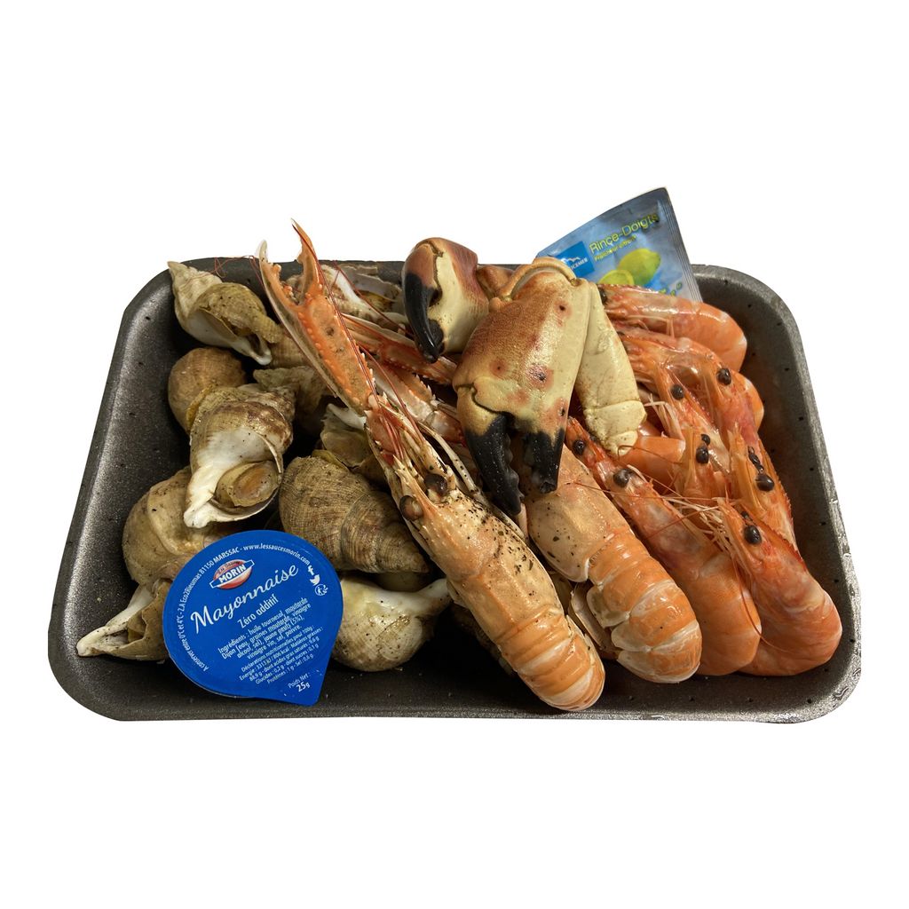 Assiette de fruits de mer : bulots cuits (500 g- Atl Nord Est) 2 langoustines cuites (125 g mini- Atl Nord Est) 2 pinces de tourteaux, ou pince de tourteaux du pacifique (120 g mini ) 16 crevettes 50/70 vanaméi(250 g mini Equateur ou Colombie)