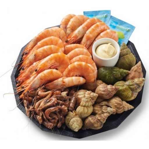 CREVETTES 40/50 (SULFITES),Buccinum undatum, Crangon crangon, Mayonnaise (Huile de colza, eau, jaune D'OEUF, MOUTARDE (eau, graine de MOUTARDE, vinaigre d'alcool, sel, antioxydant : diSULFITE de potassium, acidifiant : acide citrique), vinaigre d'alcool, sel, sucre, amidon modifié, colorants : lutéine et extrait de paprika, arôme).