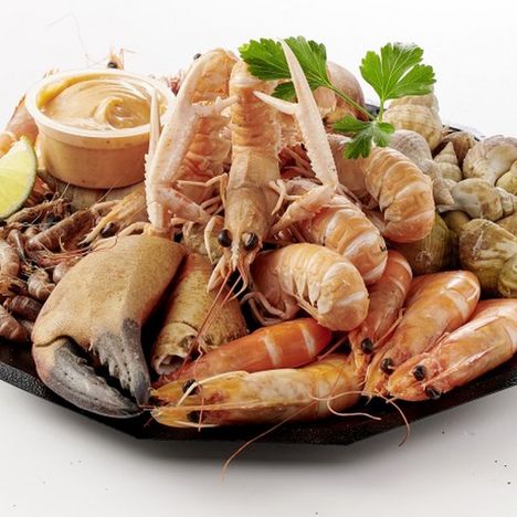 CREVETTES 40/50 (SULFITES), LANGOUSTINES 25/35 cuites, Pince de TOURTEAU , BULOTS cuits, CREVETTES grises (SULFITES), Mayonnaise (Huile de colza, eau, jaune D'OEUF, MOUTARDE (eau, graine de MOUTARDE, vinaigre d'alcool, sel, antioxydant : diSULFITE de potassium, acidifiant : acide citrique), vinaigre d'alcool, sel, sucre, amidon modifié, colorants : lutéine et extrait de paprika, arôme).