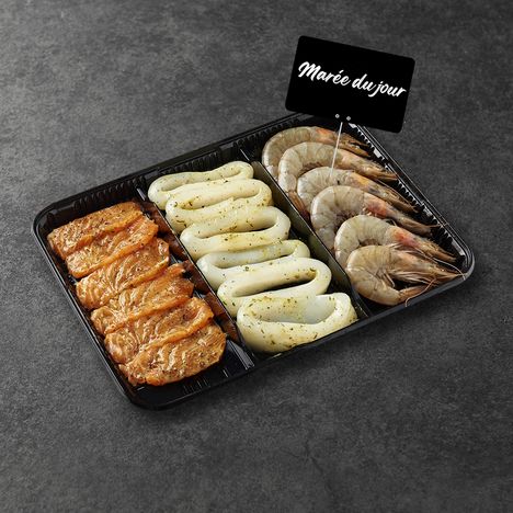 Plateau plancha saumon crevette et anneaux d'encornet mariné