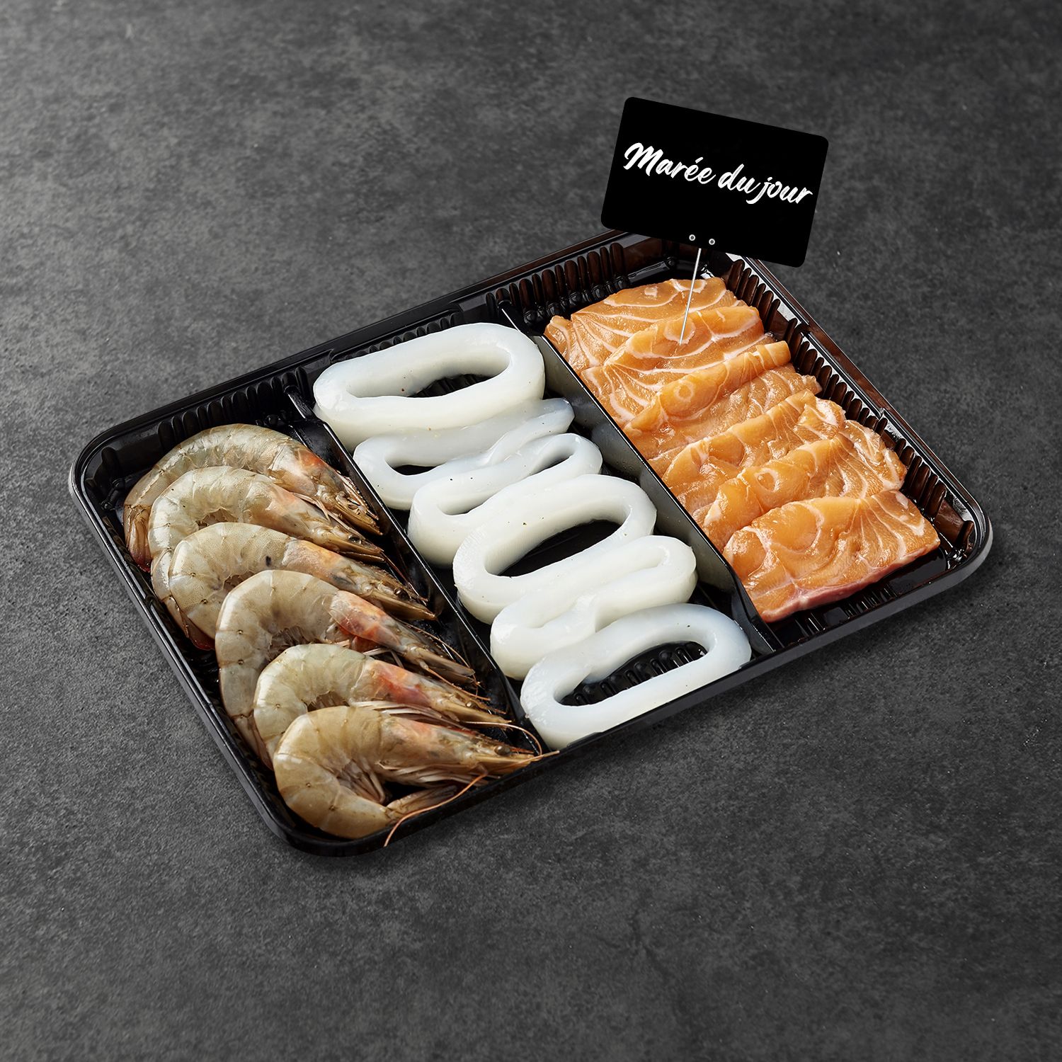 Plateau plancha saumon crevette et anneaux d'encornet nature