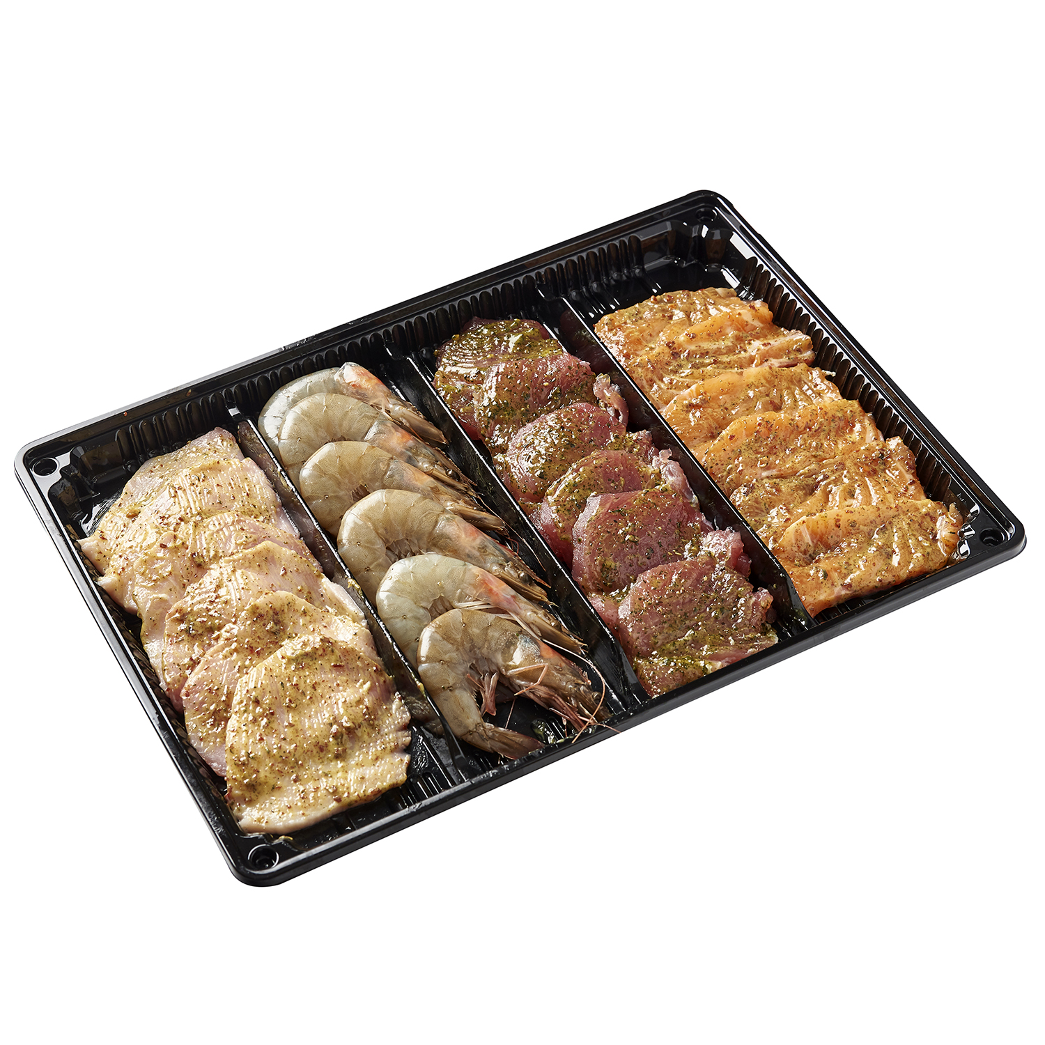 CREVETTES crues 60/80 (Penaeus vannamei (SULFITES)), Filet de SAUMON (Salmo Salar), Longe d'ESPADON (Xiphias gladius), Longe deTHON Albacore (Thunnus albacares).