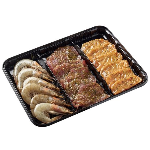 CREVETTES (Penaeus vannamei) (SULFITES), Filet de SAUMON (Salmo Salar), Thunnus albacares, Marinade olive provençale (huile et graisse végétale non hydrogénée (colza, beurre de cacao), huile de colza, huile d'olive vierge extra, sel, ail séché, poivre séché, plantes aromatiques), graisse vegetale non hydrogenee (colza, beurre de cacao), huile de colza, sel, epices (paprika, cumin), dextrose, tomates sechees, oignons seches, ail seche, plantes aromatiques, extraits d'epices, arome de fumee.