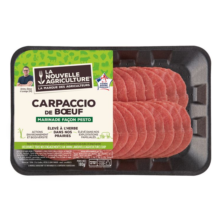 Ingrédients : Ingrédients : Viande bovine origine France (morceaux à carpaccio) 80%, marinade 20% (huile d'olive 34,8%*, huile de colza, eau, basilic 7,5%*, parmesan (lait), vinaigre d'alcool, sel, ail, jus de citron concentré). *pourcentages exprimés sur la marinade. Traces de fruits à coque.