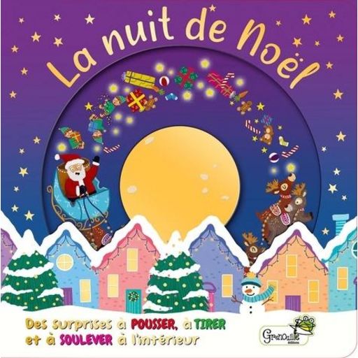 La nuit de Noël est un bel album cartonné aux multiples surprises à ouvrir, tirer et pousser, pour annoncer l'arrivée imminente du père Noël, sur le rythme d'une comptine traditionnelle. Grâce à un ingénieux système de tirettes, les habitants de la maisonnée prennent vie, l'enfant peut également s'amuser à faire voler le traîneau du père Noël dans le ciel étoilé ou même jouer avec son ventre rebondi !
