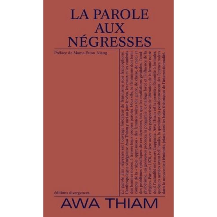 La parole aux négresses est l'ouvrage fondateur du féminisme noir francophone. L'anthropologue sénégalaise Awa Thiam y met au jour le vécu, les maux et les combats des femmes noires, à travers leurs propres paroles. Pour elle, le féminisme doit tenir compte de la triple oppression des femmes noires (de genre, de alte, de race) et des problèmes spécifiques de ces dernières, tels que les mutilations génitales, l'analphabétisme, les grossesses précoces, la polygamie, le mariage forcé et l'influence de la religion. Paru en 1978, ce livre ouvre des perspectives de libération de la femme noire dont l'actualité est encore frappante. Awa Thiam est la première féministe à formuler, quelques années avant bell hooks, la question du positionnement des femmes noires dans le mouvement féministe, jetant ainsi les bases théoriques de l'intersectionnalité.