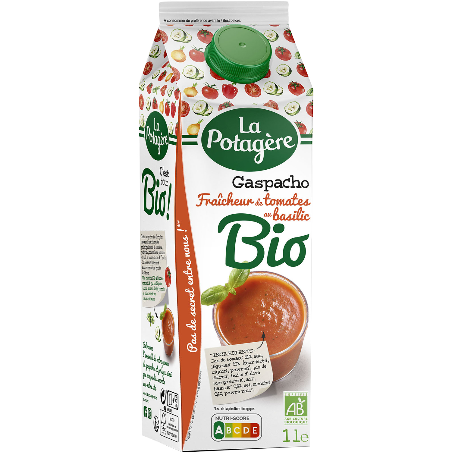Jus de tomate* 61%, eau, légumes* 10% (courgette*, oignon*, poivron*), jus de citron*, huile d’olive vierge extra*, ail*, basilic* 0,8%, sel, menthe* 0,4%, poivre noir*. *Issus de l’agriculture biologique.