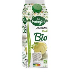 Légumes* 38% (courgette* 22,4%, petit pois* 5,7%, poivron*, oignon*), eau, jus de concombre* 25% (concombre*, jus de citron concentré*, acide ascorbique), lait de coco* (extrait de coco*, eau), jus de citron*, vinaigre de vin rouge*, ail*, huile d’olive vierge extra*, persil*, sel, cumin*, poivre noir*. *Issus de l’agriculture biologique.