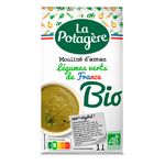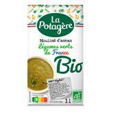 Légumes* 50% dont 34% de légumes verts* (courgettes* 13%, brocolis* 8,5%, oignons* 8,5%, épinards* 5%, carottes* 4%, poireaux*, haricots verts* 3,5%, CELERI-rave*), eau, huile d'olive vierge extra*, sel, thym*, livèche* en poudre 0,04%, marjolaine* en poudre, poivre*. *Issu de l'agriculture biologique.