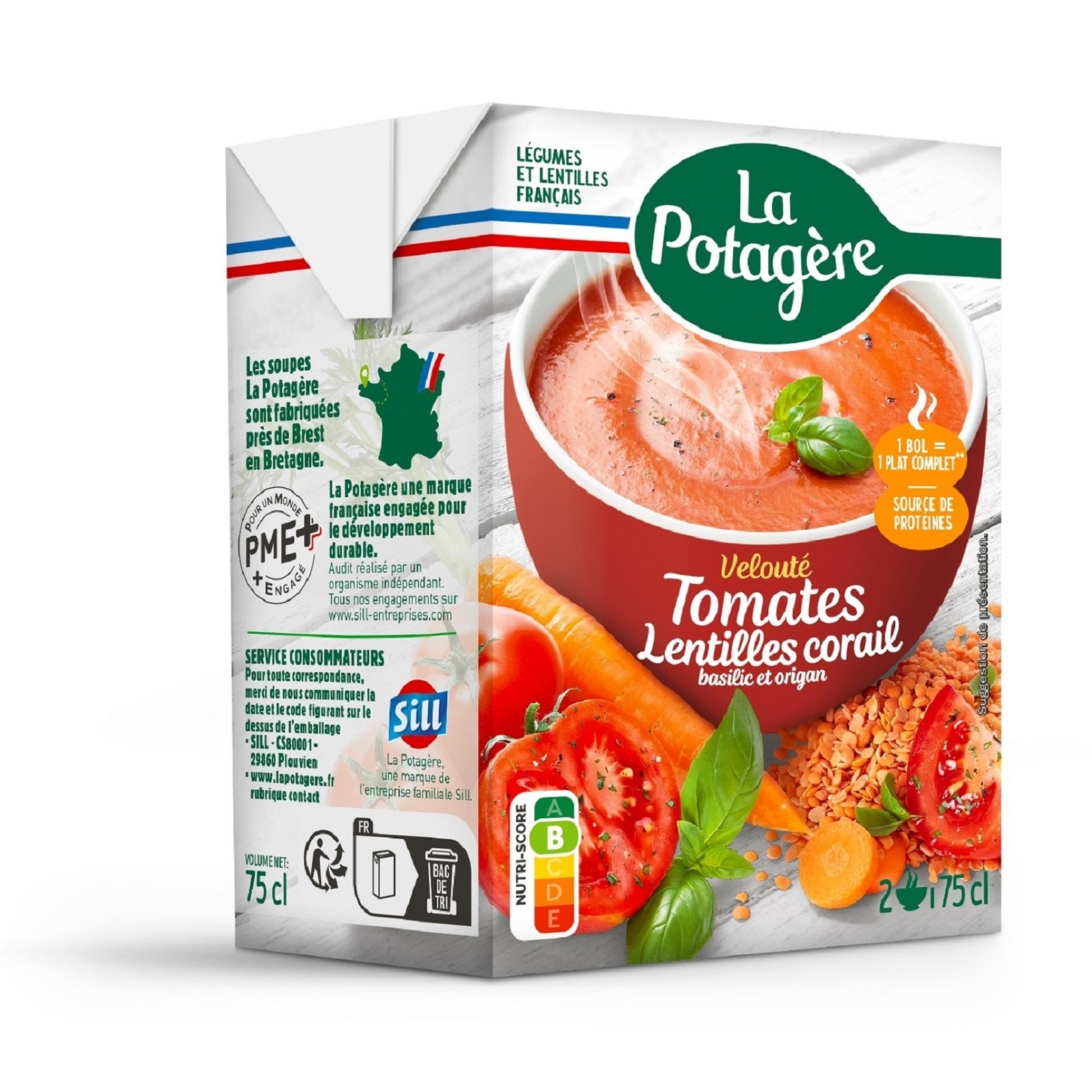 Velouté de tomate et lentilles corail au basilic et origan, potage prêt à consommer.