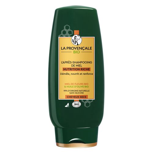 La Provençale a créé L’Après-Shampooing de Miel Nutrition Riche pour démêler, nourrir et renforcer les cheveux secs. Dès la première application, les cheveux sont nourris des racines jusqu’aux pointes pour 97%* moins de casse. Il est certifié bio, contient 99% d’ingrédients d’origine naturelle et sa formule est sans silicone. C’est grâce à sa composition naturelle qui associe le Miel de Fleurs Bio à l’Huile d’Olive Bio AOP Provence qu’il tient toutes ses promesses. *Test instrumental L’Après-Shampooing de Miel Nutrition Riche démêle, nourrit et renforce les cheveux secs. Dès la première application, les cheveux sont nourris des racines jusqu’aux pointes pour 97%* moins de casse. *Test instrumental