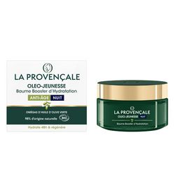 BAUME BOOSTER D'HYDRATATION ANTI-AGE OLEO-JEUNESSE. Un boost anti-âge dans un soin naturel ! LE POUVOIR DE L'OLIVE VERTE DANS UNE FORMULE A L'EFFICACITE PROUVEE Saviez-vous que la perte d'hydratation de la peau est une des 1ères causes des signes visibles de l'âge ? Ce baume de nuit anti-âge est enrichi en Omégas d'huile d'Olive verte, reconnus pour renforcer la barrière cutanée. Il booste les reserves d'hydratation durant 48h et agit durant la nuit, le moment idéal pour régénérer votre peau. Au réveil les traits sont reposés et la peau retrouve son confort. Sa souplesse est visiblement améliorée pour 83% des femmes*. TEXTURE BAUME FONDANT & SENSORIALITE UNIQUE Sa texture fondante fusionne avec la peau et son parfum laisse un délicat sillage floral. BAUME CERTIFIE BIO AVEC 98% D'INGREDIENTS D'ORIGINE NATURELLE Olives pressées au Moulin de la Balméenne. Huile d’Olive Appellation d’Origine Protégée Provence. Parfum d'origine naturelle créé dans la région de Grasse. JOUVENCE DEVIE