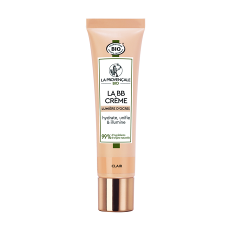 Une belle mine comme sous le soleil de Provence. La Provençale crée La BB Crème Lumière d'Ocres certifiée Bio par Ecocert avec 99% d'ingrédients d'origine naturelle. Une crème teintée qui hydrate 24h*, unifie et illumine le teint. Sa formule soin est enrichie en Huile d'Olive Bio AOP Provence qui apporte nutrition et protection. Sa texture légère et fondante dépose un voile imperceptible sur la peau, elle respire. Avec ses pigments minéraux inspirés des Ocres de Provence, la formule reflète naturellement la lumière pour un teint radieux. Jour après jour, la peau nue est plus éclatante, plus belle. Convient à tous les types de peaux. Non comédogène. Testé sous contrôle dermatologique. Disponible en 5 teintes : Clair / Moyen Clair / Moyen / Moyen Foncé / Foncé Fabriqué en France à Ormes. Tube contenant 49% de plastique recyclé**. * Test instrumental ** Hors colorants, additifs et capsule Un teint unifié et éclatant de beauté : Le teint est homogène : 92%** Le teint est lumineux :