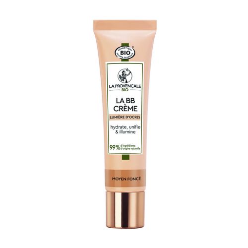 Une belle mine comme sous le soleil de Provence. La Provençale crée La BB Crème Lumière d'Ocres certifiée Bio par Ecocert avec 99% d'ingrédients d'origine naturelle. Une crème teintée qui hydrate 24h*, unifie et illumine le teint. Sa formule soin est enrichie en Huile d'Olive Bio AOP Provence qui apporte nutrition et protection. Sa texture légère et fondante dépose un voile imperceptible sur la peau, elle respire. Avec ses pigments minéraux inspirés des Ocres de Provence, la formule reflète naturellement la lumière pour un teint radieux. Jour après jour, la peau nue est plus éclatante, plus belle. Convient à tous les types de peaux. Non comédogène. Testé sous contrôle dermatologique. Disponible en 5 teintes : Clair / Moyen Clair / Moyen / Moyen Foncé / Foncé Fabriqué en France à Ormes. Tube contenant 49% de plastique recyclé**. * Test instrumental ** Hors colorants, additifs et capsule Un teint unifié et éclatant de beauté : Le teint est homogène : 92%** Le teint est lumineux :