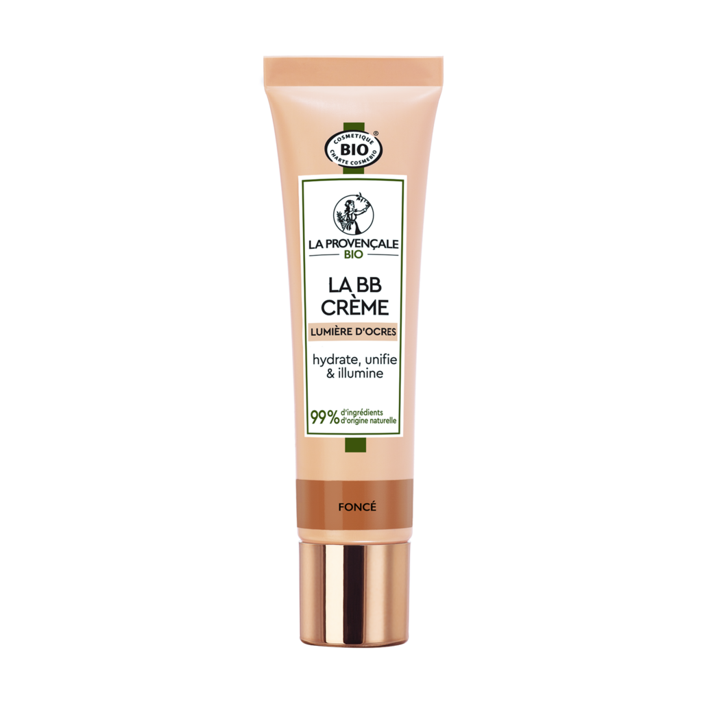 Une belle mine comme sous le soleil de Provence. La Provençale crée La BB Crème Lumière d'Ocres certifiée Bio par Ecocert avec 99% d'ingrédients d'origine naturelle. Une crème teintée qui hydrate 24h*, unifie et illumine le teint. Sa formule soin est enrichie en Huile d'Olive Bio AOP Provence qui apporte nutrition et protection. Sa texture légère et fondante dépose un voile imperceptible sur la peau, elle respire. Avec ses pigments minéraux inspirés des Ocres de Provence, la formule reflète naturellement la lumière pour un teint radieux. Jour après jour, la peau nue est plus éclatante, plus belle. Convient à tous les types de peaux. Non comédogène. Testé sous contrôle dermatologique. Disponible en 5 teintes : Clair / Moyen Clair / Moyen / Moyen Foncé / Foncé Fabriqué en France à Ormes. Tube contenant 49% de plastique recyclé**. * Test instrumental ** Hors colorants, additifs et capsule Un teint unifié et éclatant de beauté : Le teint est homogène : 92%** Le teint est lumineux :