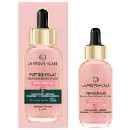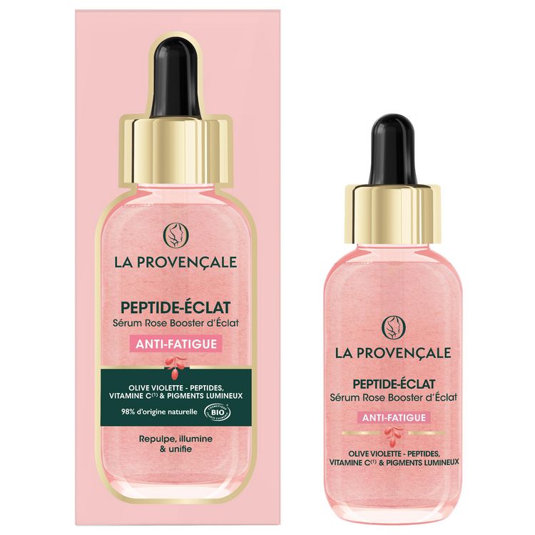 SERUM ROSE BOOSTER D'ECLAT ANTI-FATIGUE PEPTIDE-ECLAT. Un coup de boost anti-fatigue dans un soin naturel! LE POUVOIR DE L'OLIVE VIOLETTE DANS UNE FORMULE A L'EFFICACITE PROUVEE Saviez-vous que la fatigue affecte visiblement votre peau et son bon fonctionnement ? Ce sérum à la texture rosée et nacrée, inspiré de la lumière rose de Provence, est enrichi en Olive violette, dotée d'une pulpe contenant des Peptides qui agit sur la qualité de la peau pour réactiver son éclat, ainsi qu'en Vitamine C* et en Pigments lumineux. Ce sérum booste le teint pour révéler une peau visiblement rebondie, et éclatante instantanément. La peau apparait rayonnante de santé pour 92% des femmes**, repulpée et unifiée, avec une diminution visible des signes de fatigue. TEXTURE SERUM ROSE NACREE & SENSORIALITE UNIQUE Sa texture rose nacrée pénètre rapidement dans la peau et laisse un délicat parfum floral poudré. SERUM CERTIFIE BIO AVEC 98% D'INGREDIENTS D'ORIGINE NATURELLE Olives pressées au Moulin de l