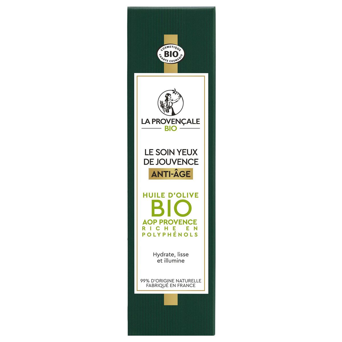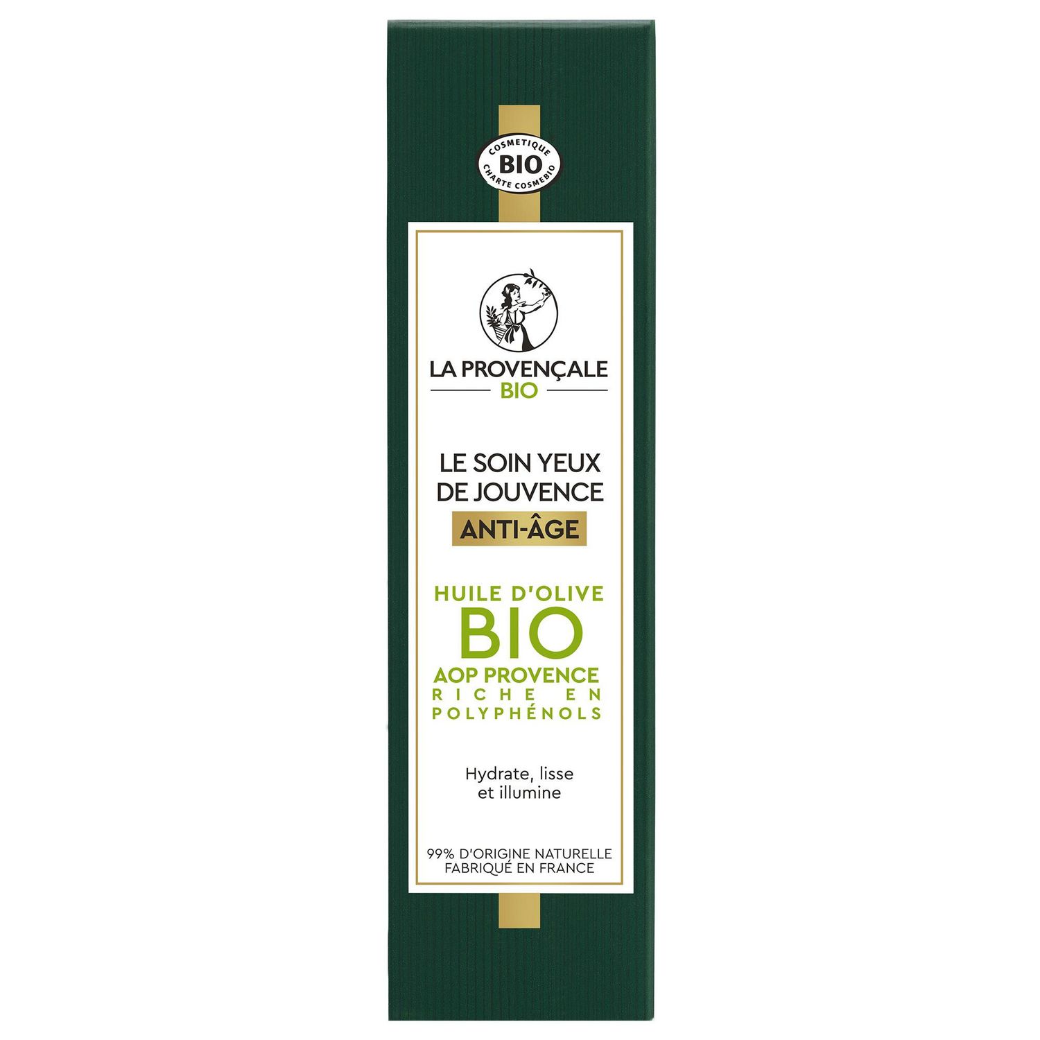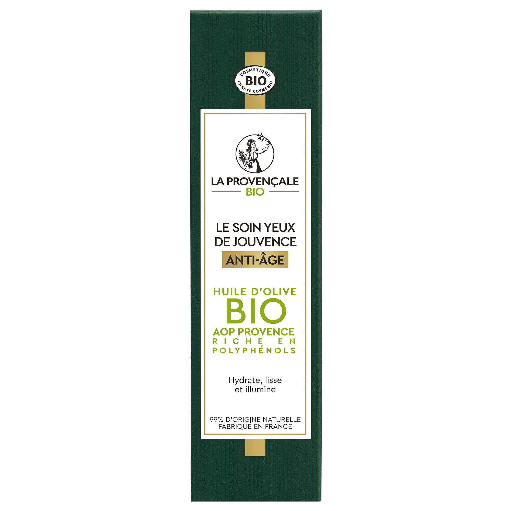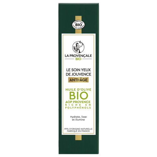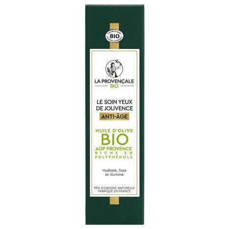 SOIN YEUX BOOSTER D'HYDRATATION ANTI-AGE OLEO-JEUNESSE. Un boost anti-âge dans un soin naturel ! LE POUVOIR DE L'OLIVE VERTE DANS UNE FORMULE A L'EFFICACITE PROUVEE Saviez-vous que la perte d'hydratation de la peau est une des 1ères causes des signes visibles de l'âge ? Ce soin anti-âge à l’efficacité prouvée est enrichi en Omégas d’huile d’Olive verte et a été spécialement conçu pour booster l’hydratation et lisser la zone délicate du contour des yeux. Le contour de l'oeil parait plus lisse pour 83% des femmes*, les poches et les cernes diminuent visiblement, votre regard s’illumine pour retrouver son apparence de jeunesse. TEXTURE LEGERE & SENSORIALITE UNIQUE Texture agréable pour 91% des femmes** SOIN YEUX CERTIFIE BIO AVEC 99% D'INGREDIENTS D'ORIGINE NATURELLE Olives pressées au Moulin de la Balméenne. Huile d’Olive Appellation d’Origine Protégée Provence. Parfum d'origine naturelle créé dans la région de Grasse. JOUVENCE DEVIENT OLEO-JEUNESSE Le Soin Yeux de Jouvence devie