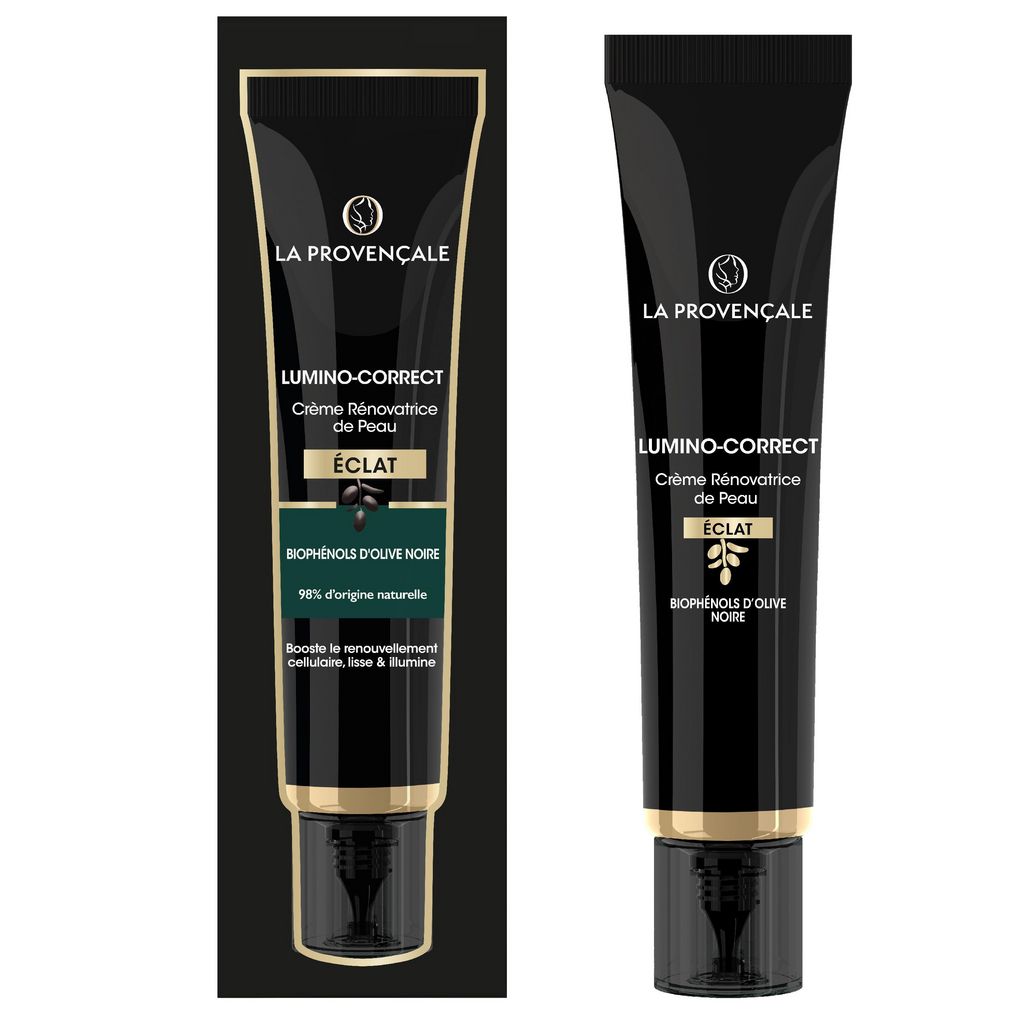 CREME RENOVATRICE DE PEAU BOOSTER D'ECLAT LUMINO-CORRECT. Un boost d'éclat dans un soin naturel ! LE POUVOIR DE L'OLIVE NOIRE DANS UNE INNOVATION A L'EFFICACITE PROUVEE Saviez-vous qu'un des 1ers moyens de faire disparaitre les taches de votre peau, c'est de renouveler ses cellules ? Cette crème est enrichie en Biophénols d'Olive noire et booste le renouvellement cellulaire. L'Olive noire, à son stade ultime de maturation, est la plus riche en actifs comme les Biophénols. Ces Biophénols sont associés dans ce sérum à de l'Endophytol, prouvé pour diminuer l'hyperpigmentation dans la peau, ainsi qu'à de la Niacinamide, reconnu pour corriger efficacement les taches. Cette crème renouvelle chaque jour +5 millions de cellules* pour un teint visiblement plus éclatant pour 87% des femmes**, un grain de peau comme lissé pour 90%***. Votre teint est plus unifié et rayonnant jour après jour. TEXTURE LEGERE & SENSORIALITE UNIQUE Sa texture légère, appréciée par 96% des femmes**, pénètre rapi