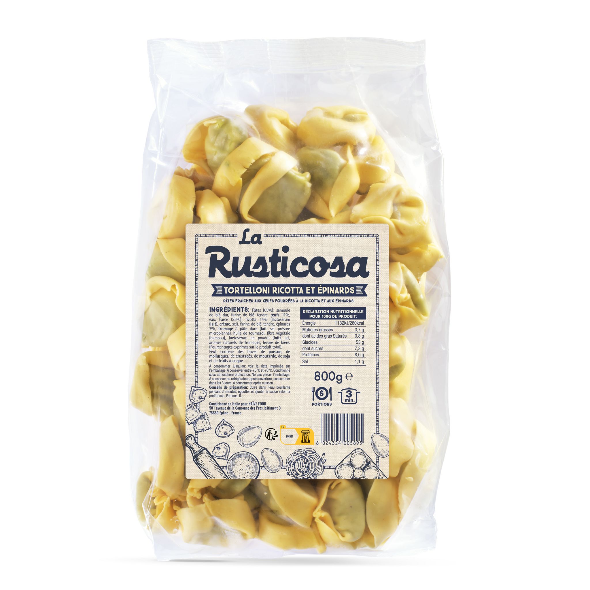 Pâtes (65%) : semoule de blé dur, farine de blé tendre, œufs 11%, eau. Garniture (35%) : fromage ricotta 14% (LAIT de lactosérum, crème de LAIT, sel), farine de blé tendre, épinards 7%, fromage à pâte dure (LAIT, sel, présure microbienne), huile de tournesol, fibres végétales (bambou), lactosérum en poudre , sel, arôme naturel de fromage, levure de bière. (Pourcentages exprimés sur le produit fini).