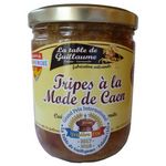 Estomacs et pieds de bœuf, eau, carottes, oignons, poireaux, céleri, vin blanc (sulfites), ail, sel, épice, plantes aromatiques.Viande d'origine française.