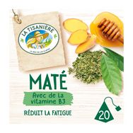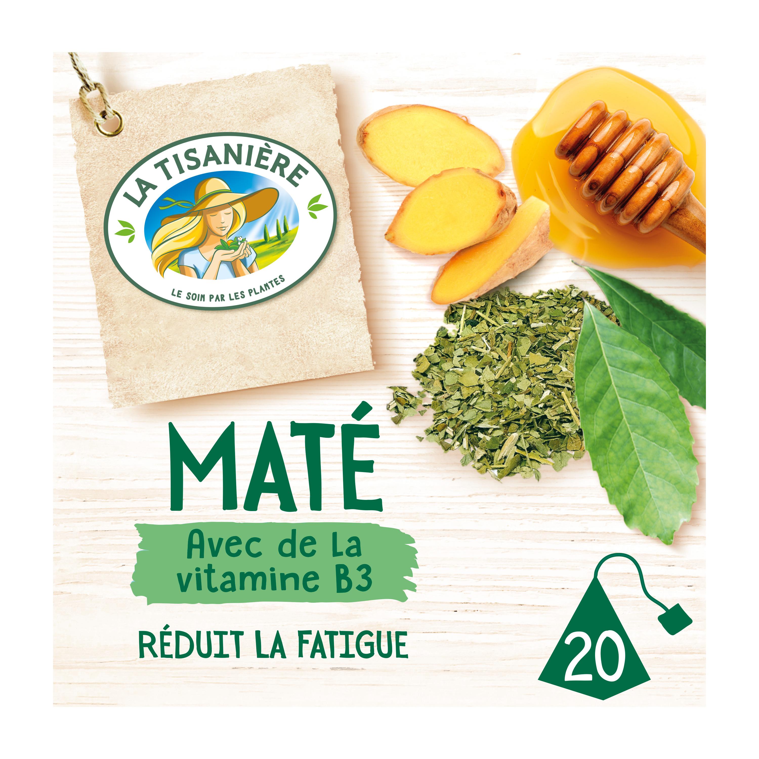 Ingrédients : maté (26%), feuilles d’oranger, gingembre (20%), rooibos, réglisse, arôme naturel de miel avec autres arômes naturels (4%), arôme naturel de gingembre avec autres arômes naturels (2,5%), niacine (vitamine B3).