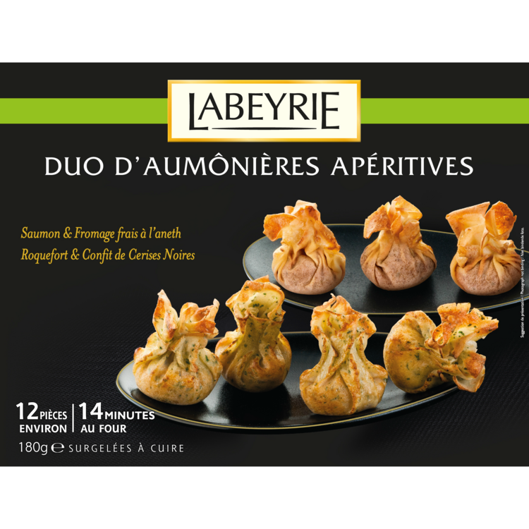 Aumônière de saumon et fromage frais, à l’aneth (50%) : pâte de BLE précuite 33%* (eau, farine de BLE, huile de tournesol, blanc d’OEUF et OEUF entier en poudre, sel, persil déshydraté), SAUMON Atlantique (Salmo salar) 28%*, pain de mie (farine de BLE, eau, huile de colza, sucre, levure, arôme (contient alcool), sel, GLUTEN de BLE, dextrose, conservateur : propionate de calcium, farine de fèves, émulsifiant : mono- et diglycérides d’acides gras, agent de traitement de la farine : acide ascorbique), CREME liquide (CREME, stabilisant : carraghénanes), FROMAGE frais 7,1%*, blanc d’OEUF liquide pasteurisé (blanc d’OEUF, stabilisants : gomme xanthane et gomme guar), chapelure (farine de BLE, sel, calcium, fer, vitamines : B3 et B1), tomates semi-deshydratées, poudre d’AMANDES, huile d’olive vierge extra, basilic, aneth 0,5%*, pulpe de citron, sel, épaississants : gomme xanthane et gomme guar ; piment de Cayenne, dextrose. Aumônière au roquefort et confit de cerises noires (50%) : pâte de BLE précuite 33%* (eau, farine de BLE, huile de tournesol, blanc d’OEUF et OEUF entier en poudre, sel), FROMAGE frais, FROMAGE Roquefort 12%*, confit de cerises noires 11% (sucre de canne, cerises noires 5,4%*, acidifiant : jus concentré de citron, gélifiant : pectines), CREME liquide (CREME, stabilisant : carraghénanes), OEUF entier liquide, huile d’olive vierge extra, persilfibre de BLE, épaississants : gomme xanthane et gomme guar ; sel, dextrose.*Pourcentages exprimés sur chaque aumônière.