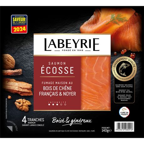 SAUMON ATLANTIQUE D'ECOSSE FUME 4 TRANCHES 140 G Voyagez près des lacs Ecossais avec un Saumon fumé d'Ecosse aux saveurs boisées. Appréciez les tranches fines et la texture ferme de ce saumon.