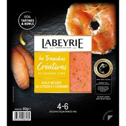 TRANCHES CREATIVES DE SAUMON ATLANTIQUE DE NORVEGE FUME AU BOIS DE HETRE, HUILE DE CITRON ET COMBAWA, 4 A 7 TRANCHES, 80G, DECONGELE