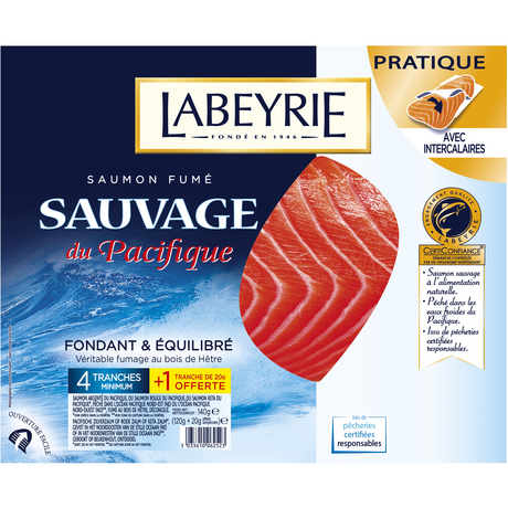 SAUMON SAUVAGE DU PACIFIQUE FUME AU BOIS DE HETRE, 4 TRANCHES + 1 TRANCHE OFFERTE 120 G + 20 G OFFERTS