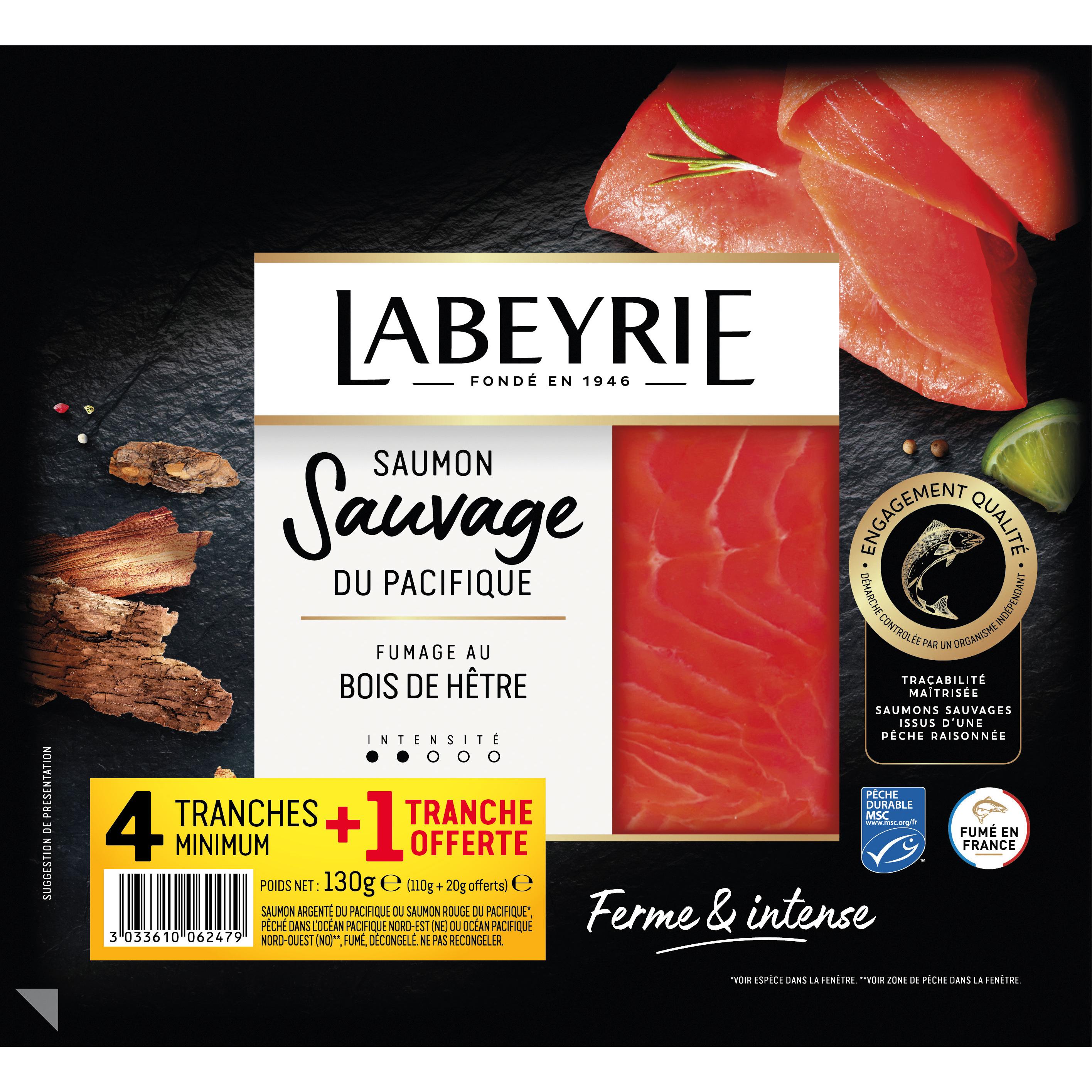 SAUMON SAUVAGE DU PACIFIQUE FUME AU BOIS DE HETRE, 4 TRANCHES + 1 TRANCHE OFFERTE 120 G + 20 G OFFERTS