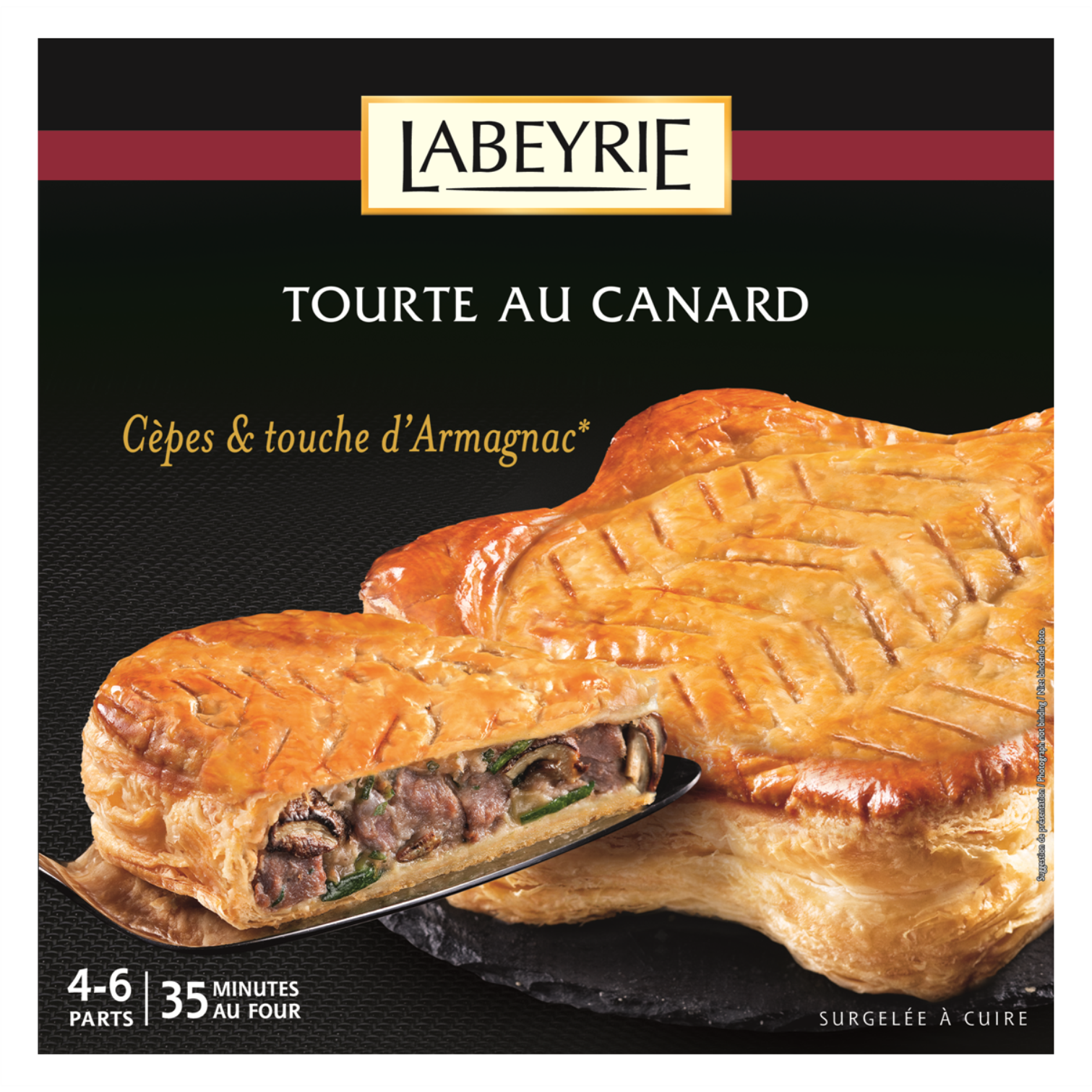 Tourte de pâte feuilletée (50%) garnie d'une préparation (50%) à base d'effiloché de viande de canard cuite, de cèpes et Armagnac, crue à cuire, surgelée Une pâte feuilletée légère et croustillante garnie de viande de canard moelleuse, de morceaux de cèpes parfumés et relevés par une pointe d’Armagnac pour un goût subtil et raffiné.