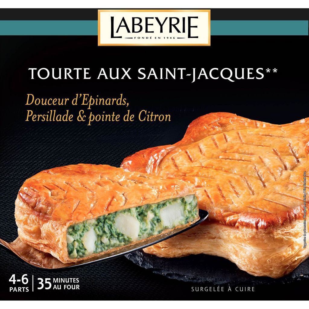 Tourte à base de pâte feuilletée (50%*) garnie d’une préparation à based’épinards, de noix de Saint-Jacques**, d’une persillade et de citrons confits –Surgelée crue à cuire.