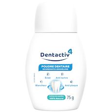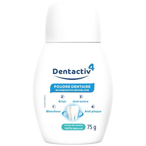 DENTACTIV4 est une poudre dentaire pour le blanchiment des dents, formulée à base de bicarbonate de sodium et de bromélaïne. DENTACTIV4 diminue le tartre et la plaque dentaire et apporte éclat et blancheur aux dents. S'utilise seul ou en association avec le dentifrice. DENTACTIV4 doit être utilisé 1 à 2 fois par semaine.