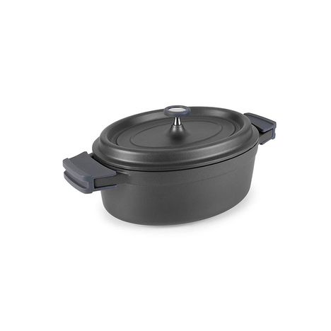 Lacor 25933 La cocotte ovale Fundicion Lacor 25933 est parfaite pour cuire tous vos plats : riz, viandes, poissons, légumes, plats mijotés, crèmes, sauces ou soupes ! En fonte d'aluminium : garantit l'absorption et la distribution uniforme de la chaleur sans point de surchauffe. Les aliments ne perdent donc pas leur jus pendant la cuisson et conservent ainsi tous leurs nutriments et vitamines. Les picots, situés sous le couvercle, permettent aux gouttes, issues de la condensation, de retomber sur les aliments, formant ainsi un flux permanent de circulation qui réduit la perte des saveurs et des jus des aliments. Revêtement antiadhésif intérieur et extérieur Ilag Ultimate. Livré avec 2 sur-poignées et un protège-bouton de couvercle amovibles en silicone noir afin de manipuler la cocotte en toute sécurité.